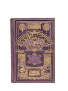 La Jangada / 800 lieues sur l'Amazone par Jules Verne. Illustrations de Benett. Paris, Bibliothèque d'Éducation et de Récréation, J. Hetzel Éditeur, sd (1881). Grand in-8° double,. Cartonnage éditeur en pleine percaline violette «aux deux éléphants» du 2e type Lenègre. Tranches dorées. Gardes bleu. Catalogue «AP» pour 1881-1882. Imprimerie Gauthier-Villars. Édition originale illustrée (seconde émission du premier tirage contenant l'errata) et premier cartonnage. Dos très légèrement éteint. Sinon, bel exemplaire dans une couleur rare !