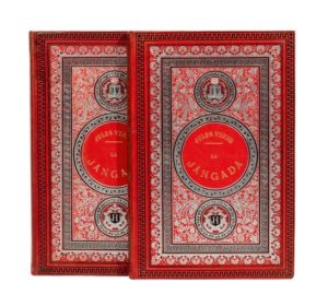 La Jangada / 800 lieues sur l'Amazone par Jules Verne. Illustrations de Benett. Paris, Bibliothèque d'Éducation et de Récréation, J. Hetzel Éditeur, sd (1898). Deux volumes grands in-8° simples. Cartonnages éditeur en pleine percaline rouge (seule couleur) «aux initiales, argentée». Magnier et ses fils relieurs. Tranches dorées. Gardes bleu-gris. Catalogue «D» pour 1895-1896 en fin du second volume. Imprimerie Gauthier-Villars. Édition originale illustrée. Coiffes du second tome restaurées. Tout petit manque au bas de la page 187. Sinon, très bel exemplaire.