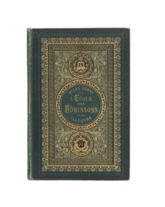 L'École des Robinsons par Jules Verne. Illustrations de L. Benett. Paris, Bibliothèque d'Éducation et de Récréation, J. Hetzel et Cie, sd (1882). Grand in-8° simple. Cartonnage éditeur en pleine percaline vert de vessie «aux initiales JV-JH». Charles Magnier Relieur. Tranches dorées. Gardes bleu. Catalogue «BC» pour 1882-1883. Imprimerie Gauthier -Villars. Édition originale illustrée et premier cartonnage simple. Bel exemplaire.