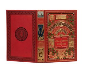 L'École des Robinsons /Le Rayon vert par Jules Verne. Illustrations de L. Benett. Paris, Collection Hetzel, sd (ca 1908). Grand in-8° double. Cartonnage éditeur polychrome «à un éléphant titre dans le cartouche». Engel Relieur. Tranches dorées. Gardes bleu. Six planches hors-texte en couleurs. Imprimerie Belin. Un exemplaire proche de l'état de neuf ! De toute rareté dans cette condition. Les hors-textes sont, désormais, pour la plupart en couleurs.
