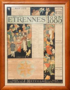 Affiche Hetzel pour les Étrennes 1885 dite «Boulevard des livres». Paris, J. Hetzel et Cie, 1884. Strasbourg, Chromotypographie de G. Fischbach. Affiche d'intérieur en couleurs de format 48 x 66 cm. Encadrée. Illustration de D. Séméghini. Annonce pour les nouveautés L'Étoile du Sud et L'Archipel en feu. Très bel état. Supplément à Paris Illustré du 1er janvier 1885. Deux manques comblés à des pliures.