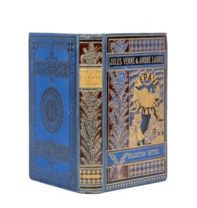 L'Épave du Cynthia par Jules Verne & André Laurie. Illustrations de Georges Roux. Paris, Bibliothèque d'Éducation et de Récréation, J. Hetzel et Cie, 1885. Petit in-8°. Cartonnage éditeur «à la fougère bicolore» prune sur bleu azur du 1er type. Sans mention de relieur (sans doute Engel). Tranches dorées. Gardes marron. Catalogue «CS» pour 1885-1886. Typographie G. Chamerot. Édition originale illustrée et premier cartonnage. Très bel exemplaire, dans une alliance de couleurs superbe. Rare !