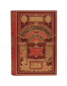 Robur le Conquérant / Un billet de loterie par Jules Verne. Illustrations de Benett (Robur le conquérant) et Georges Roux (Un billet de loterie). Paris, Bibliothèque d'Éducation et de Récréation, J. Hetzel et Cie, 1886. Grand in-8° double, cartonnage éditeur en pleine percaline rouge «aux deux éléphants». Lenègre Relieur. Tranches dorées. Gardes bleu. Catalogue «DF» pour 1886-1887. Imprimerie Gauthier-Villars. Éditions originales illustrées et premier cartonnage en volume double. Petite décoloration au second plat. Sinon, bel exemplaire.