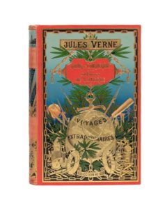 Robur le Conquérant par Jules Verne. Illustrations de Benett. Paris, Collection Hetzel, sd (ca 1903). Grand in-8° simple. Cartonnage éditeur polychrome «au steamer» et à la pastille rouge. Ch. Magnier Relieur. Tranches dorées. Gardes bleu. Trois planches hors-texte en couleurs. Imprimerie Belin. Superbe exemplaire ! Eblouissant !