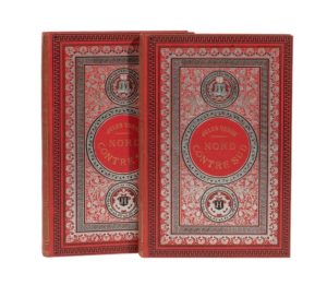 Nord contre Sud par Jules Verne. Illustrations de Benett. Paris, Bibliothèque d'Éducation et de Récréation, J. Hetzel Éditeur, 1887 (1898 pour les cartonnages). Deux volumes grands in-8° simples. Cartonnages éditeur en pleine percaline rouge (seule couleur) «aux initiales, argentée». Magnier et ses fils relieurs. Tranches dorées. Gardes bleu-gris. Six planches hors-texte en couleurs. Catalogue «D» pour 1895-1896 en fin du second volume. Imprimerie Gauthier-Villars. Édition originale illustrée avec les six gravures tirées en couleurs. Rousseurs sur le frontispice et la page de titre du tome 1. Sinon, magnifique exemplaire !