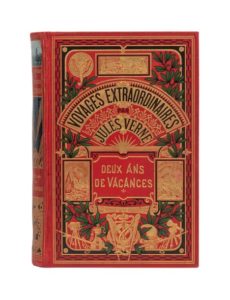 Deux ans de vacances par Jules Verne. Illustrations de Benett. Paris, Collection Hetzel, sd (ca 1910). Grand in-8° double. Cartonnage éditeur polychrome «à un éléphant titre dans le cartouche». Percaline rouge foncé. Engel Relieur. Tranches dorées. Gardes bleu. Six planches hors-texte en couleurs. Imprimerie Belin. Coiffes restaurées. 1re garde fendue. Sinon, bel exemplaire.