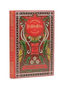 Sans dessus dessous par Jules Verne. Illustrations de George Roux. Paris, Collection Hetzel, sd (ca 1912). Grand in-8° simple. Cartonnage éditeur polychrome «aux feuilles d'acanthe». Charles Magnier Relieur. Tranches dorées. Gardes bleu. Les planches hors-texte sont maintenant inscrites dans la pagination et sont tirées en noir. Imprimerie Gauthier-Villars. Quelques rares rousseurs. Bel exemplaire. Rare dans ce cartonnage !