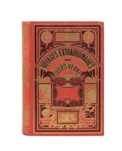 César Cascabel par Jules Verne. Illustrations de Georges Roux. Paris, Bibliothèque d'Éducation et de Récréation, J. Hetzel Éditeur, sd (ca 1890). Grand in-8° double. Cartonnage éditeur en pleine percaline rouge (seule couleur) «aux deux éléphants» portant la mention «Collection Hetzel» au premier plat. Lenègre Relieur. Tranches dorées. Gardes bleu. Douze planches hors-texte en couleurs et deux cartes. Catalogue «FX» pour 1891-1892. Imprimerie Gauthier-Villars. Édition originale illustrée et premier cartonnage concomitant avec la version «aux deux éléphants, argenté». Dos passé. Sinon, bel exemplaire de ce cartonnage monochrome presque confidentiel.