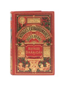 Mistress Branican par Jules Verne. Illustrations de L. Benett. Paris, Collection Hetzel, sd (ca 1910). Grand in-8° double. Cartonnage éditeur polychrome «à un éléphant titre dans le cartouche». Percaline rouge foncé. Tranches dorées. Gardes bleu. Engel relieur. Six planches hors-texte en couleurs + deux cartes. Imprimerie Belin. Bel exemplaire. Rousseurs. Sinon, bel exemplaire de ce titre peu commun dans ce cartonnage.