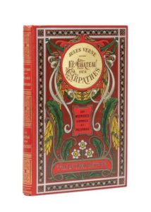 Le Château des Carpathes par Jules Verne. Illustrations de Benett. Paris, Collection Hetzel, sd (ca 1908). Grand in-8° simple. Cartonnage éditeur polychrome «aux feuilles d'acanthes et à la pastille dorée». Ch. Magnier et ses Fils relieurs. Tranches dorées. Gardes bleu. Trois planches hors-texte en couleurs. Imprimerie Belin. Quelques rousseurs. Sinon, superbe exemplaire. Cartonnage somptueux (le dos !).
