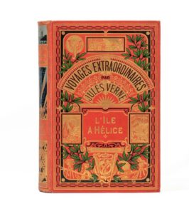 L'Île à hélice par Jules Verne. Illustrations de L. Benett. Paris, Collection Hetzel, sd (ca 1905). Grand in-8° double. Cartonnage éditeur polychrome «à un éléphant titre dans le cartouche». Engel Relieur. Tranches dorées. Gardes bleu. Six planches hors-texte en couleurs. Imprimerie Belin. Dos légèrement passé. Sinon, bel exemplaire de ce titre rare dans ce cartonnage.
