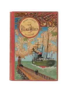 Le Village aérien par Jules Verne. Illustrations de George Roux. Paris, Collection Hetzel, sd (1901). Grand in-8° simple. Cartonnage éditeur polychrome «au steamer et à la pastille dorée». Ch. Magnier et Fils relieurs. Tranches dorées. Gardes bleu-gris. Six planches hors-texte en couleurs. Imprimerie Gauthier-Villars. Édition originale illustrée et premier cartonnage simple. Très bel exemplaire.