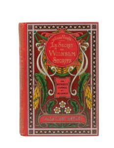 Le Secret de Wilhelm Storitz par Jules Verne. Illustrations de George Roux. Paris, Collection Hetzel, 1910. Grand in-8° simple. Cartonnage éditeur polychrome «aux feuilles d'acanthe». Charles Magnier Relieur. Tranches dorées. Gardes bleu. Six planches hors-texte en couleurs. Imprimerie Gauthier-Villars. Édition originale illustrée et premier cartonnage simple. Très bel exemplaire.