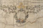 NOLIN (J.B.) Le canal royal de Languedoc pour la jonction de l'Océan et de la mer Méditerrané, dédié et présenté à Mgrs des états de Languedoc. Carte sur 3 feuilles avec contours coloriés. Paris, Nolin, 1697. Titre en haut dans un cartouche illustré de figures allégoriques, avec 3 médailles à l'effigie de Louis XIV. En bas à gauche, dédicace et guirlande d'écus aux armes des évêques et archevêques du Languedoc et en bas à droite, armes des conseillers d'états. Autour de la carte, 46 plans d'aqueducs et d'écluses. Encadrée sous verre. 72 x 145,8 (à vue). Pliures, restaurations, salissures, coloris fanés.