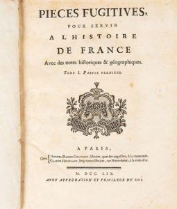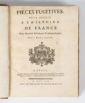 BASCHI (Charles de, marquis d'Aubais) & MENARD (Léon) Pièces fugitives pour servir à l'histoire de France. Avec des notes historiques et géographiques. Paris, Chaubert, 1759, 3 vol. in-4, demi-rel.bas. fauve marbr, dos à nerfs, ornés. Le tome I est en 2 parties. Qq. piqûres et rousseurs.