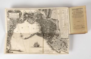 BRUSCO (Giacomo) Description des beautés de Gênes et de ses environs. Gênes, 1788, bas. marbr.,dos lisse, tr. rouge. Deuxième édition. Avec une grande carte repliée en frontispice, un plan et 15 gravures certaines repliées. Mouillures.