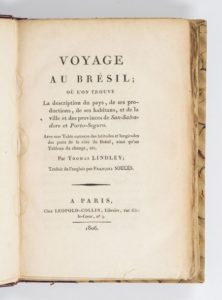 LINDLEY Voyage au Brésil, où l'on trouve la description du pays, de ses productions, de ses habitants et de la ville et des provinces de San-Salvadore et Porto-Seguro. Paris, Léopold-Collin, 1806, in-8, demi-rel. chag. bordeaux, dos à nerfs (rel. mod.). Avec une table des latitudes et longitudes des ports de la côte du Brésil, ainsi qu'un tableau des changes.