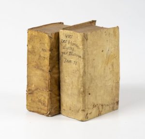 PLUTARQUE Les vies des hommes illustres grecs et romains. Translatées par M. Jacques Amyot. S.l., (Lyon), Guillaume de Laemarie, 1594, 2 vol. in-8, 16 ff. - 1180 pp. - 23 ff. - 1 bl. - 1294 pp. - 2 bl. -14 ff., vélin, trace de lacets (rel.us.). Gardes renouvelées et fortes mouillures.