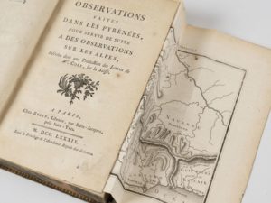 RAMOND DE CARBONNIERES (Louis-François) Observations faites dans les Pyrénées pour servir de suite à des observations sur les Alpes. Paris, Belin, 1789, 2 parties réunis en un vol.in-8, veau marbr., triple filets encadr. les plats, dos à nerfs, richement orné (mors fatigués). EDITION ORIGINALE. Avec 3 planches. Taches d'encre aux gardes et pet. déchirure angulaire à une garde et déchirure marginale à la p. 11 sans atteindre le texte.