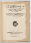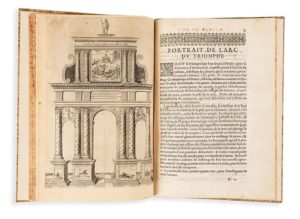 SAXI (Pierre) Entrée de Loys XIII, roy de France et de Navarre, dans sa ville d'Arles, le XXIX octobre 1622. En Avignon, Bramereau, 1623, in-fol. bradel, 3 ff. - 68 pp. - 1 f. bl., vélin rigide (rel. mod.). Avec 8 planches (sur 9) d'arcs triomphaux. Le f. 49-50 est manquant. Fortes Rousseurs au titre. Pet. déchirure marginale à la p. 47 avec pet.mq. de papier.