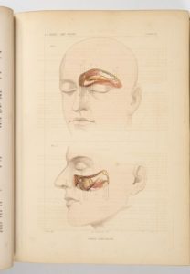 BERAUD (J.B.) Atlas complet d'anatomie chirurgicale topographique. Paris, Baillière, 1865, in-4, demi-rel. à coins chag. fauve, dos à nerfs. Atlas qui a nécessité 7 ans de recherche à Béraud. Illustré de 109 planches coloriées reproduisant 162 figures dessinées d'après nature par M. Bion et finement gravées sur acier. Qq. rousseurs et qq. mouillures.