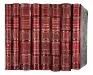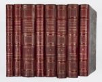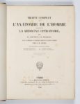 BOURGERY (M.J.B.) - JACOB (N.H.) Traité complet de l'anatomie de l'homme, contenant la médecine opératoire. Paris, Delaunay, 1840-1854, 8 forts vol. in-fol., demi-rel. chag. rouge, dos à nerfs, orné de caissons dor. Un des plus beaux traités d'anatomie du XIXème siècle. Avec un frontispice, 8 pages de titre et bien complet de ses 726 planches, la plupart lithographiées en noir certaines dépliantes et dessinées d'après nature par Nicolas Henri Jacob. Claude Bernard y collabora à partir de 1845 en préparant des pièces anatomiques. Tome I (1840) : Ostéologie, syndesmologie. 191 pp. de texte et 59 planches numérotées de 1 à 59. Soit 59 planches. Tome II (1852) : Appareil de relation, organes de la locomotion. 141 pp. de texte et 100 planches numérotées de 60 à 159. Soit 100 planches. Tome III (1844) : Anatomie descriptive et physiologique. 341 pp. de texte et 115 planches numérotés de 1 à 100 et 15 bissées. Soit 115 planches. Tome IV (1851) : Angéiologie. 162 pp. de texte avec 91 planches numérotées de 1 à 91 et 7 bissées. Soit 98 planches. Tome V (1839) : Organes de la digestion. 342 pp. de texte et 76 planches numérotées de 1 à 76 et 20 bissées soit 96 planches. Tome VI (1852) : Médecine opératoire. 280 pp. de texte, avec 91 planches numérotées 1 à 91 et 2 bis, soit 93 planches. Tome VII (1840) : Médecine opératoire, 356 pp. de texte - LII p., 77 planches, 5 planches bissées et 16 planches lettrées de A à P. Soit 103 planches. Tome VIII (1854) : Embryogénie. VIII- 335 pp., 60 planches numérotées de 1 à 60 et 7 bissées. Soit 67 planches. Brunet I, 1179. Rousseurs, brunissures à qq. planches, qq accidents aux dos des rel. BOURGERY - JACOB. Traité complet de l'anatomie de l'homme. Anatomie chirurgicale et médecine opératoire. Supplément par le Dr. Duchaussoy. Paris, Guérin, 1867-1868, in-fol. demi-rel.chag. rouge, dos à nerfs, orné. Avec 24 planches. Qq. mouillures. TRAITE D'ANATOMIE, d'ostéologie et de miologie nécessaire au dessin. Paris, chez Jean, s.d., in-fol. br., couv. impr. avec des mq. Avec un frontispice et 12 planches. Fortes rousseurs. JACOB. Traité complet de l'anatomie de l'homme comprenant la médecine opératoire par le Docteur Bourgery. Atlas. Tome huitième. Paris, Delaunay, 1834, in-4, cart. percal. noire us. Avec 20 planches lithographiées et coloriées dont une très grande. Ens. de 11 vol.