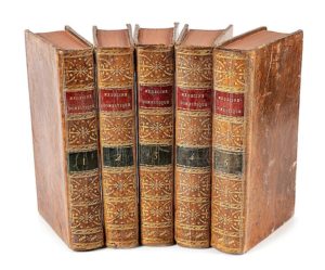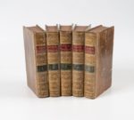 BUCHAN (G.) Médecine domestique ou traité complet des moyens de conserver sa santé et de guérir les maladies par le régime et les remèdes simples. Traduit de l'anglais par J.D. Duplanil. Cinquième édition. Paris, Moutardier, An X (1802), 5 vol. in-8, veau marbr., dos lisse, ornés, pièce de titre et de tomaison rouge et verte. Avec un portrait en frontispice. Qq. rousseurs et épidermures sur les plats.