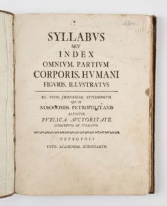 CHOVET (Abraham) Syllabus seu index omnium. Partium corporis humani figuris illustrates. Petropoli, Typis academiae scientiarum, s.d. (1743), in-4, 7 pp. - 1 p. bl. - 69 pp. - 3 pp. plein papier, dos à nerfs. Avec 26 planches. La première planche a été restaurée. Qq. galerie de vers à certaines planches. Mouillures.