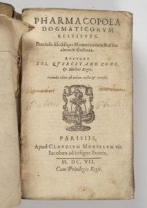 DU CHESNE (Joseph) Pharmacopoea dogmaticorum restituta. Paris, Claudium Morellum,1607, in-8, 4 ff. - 619 pp. - 13 ff. n. ch. (table et privilège), vélin, traces de lacets (rel. de l'époque). La première édition est parue en 1603 en français. Dos us. avec mq.