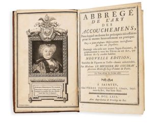 LE BOURSIER DU COUDRAY Abrégé de l'art des accouchements dans lequel on donne les préceptes nécessaires pour le mettre heureusement en pratique. Nouvelle édition. Saintes, Pierre Toussaint, 1769, in-8, veau marbr., dos lisse (dos us.). Deuxième édition après l'édition originale de 1759 et la première illustrée. Avec un frontispice et 25 (sur 26) planches en couleurs. Qq. mouillures.