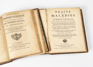 MAURICEAU (François) Traité des maladies des femmes grosses et de celles qui sont accouchées, enseignant la bonne & véritable méthode pour bien aider les femmes en leurs accouchements naturels. Paris, 1740. - Observations sur la grossesse de l'accouchement des femmes. Paris, 1738, ens. de 2 vol. in-4, veau marbr., dos à nerfs, orné (mors rest., rel. frottées). Le tome 1 contient 32 planches. Suivi au tome 2 : Dernières observations sur les maladies des femmes grosses et accouchées. Paris, 1738. 86 pp. Rousseurs.