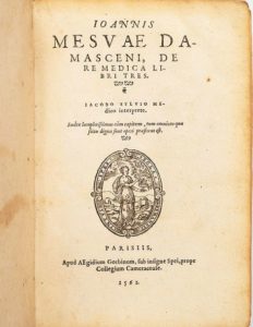 MESUE (Jean) Ioannis Mesuae Damasceni, de re medica libri tres. Parisiis, Ap. aegidium Gorbinum, …