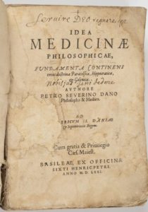 SEVERINUS (Petrus) Idea Medicinae philosophicae. Basilae, ex officia sixti Henrici Petri, 1751, in-8, 7 ff. - 1 f. bl. - 416 pp. ch. - 8 ff., vélin souple sali (rel. de l'époque). EDITION ORIGINALE. Titre abîmé restauré et galerie de vers au f.2 et 3 attaquant un peu le texte. Le dernier feuillet est la marque de l'imprimeur. Brunissures et qq mouillures.