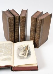 BUFFON OEuvres complètes de Buffon. Avec des extraits de Daurenton. Paris, Furne, Tome 1. Matières générales (2 vol.) 1878. - Tome 5. Les oiseaux. 2 vol. (1867) - Tome IV. Les mammifères (2 vol.). Ens. de 6 vol. in-4, demi-rel. à coins chag. marron, dos à nerfs, orné de caissons dor. Avec de nombreuses planches en couleurs. Collection incomplète.