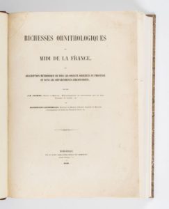 JAUBERT (B.) - BARTHELEMY- LAPOMMERAYE (C.J.) Richesses ornithologiques du midi de la France, ou description méthodique de tous les oiseaux observés en Provence et dans les départements circonvoisins. Marseille, Barlatier-Fessard et Demonchy, 1859, in-4, demi-rel. chag. marron, dos à nerfs (rel. mod.). Avec 20 planches (sur 21) lithographiées par Susini et coloriées. Incomplet de la planche du cygne de Bewick qui manque souvent. Qq. mouillures au début et à la table.