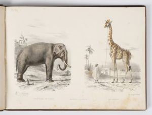 TRAVIES Buffon en estampes. Paris, Ledot ainé, s.d. (c. 1860), in-4, oblong, demi-rel. chag. marron, dos à nerfs (rel. de l'époque). Avec 24 planches en couleurs. Qq. rousseurs et piqûres.