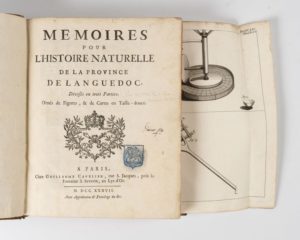 ASTRUC (Jean) Mémoires pour l'histoire naturelle de la province de Languedoc. Divisée en 3 parties. Paris, Cavelier, 1737, in-4, veau brun, dos à nerfs, orné (rel. de l'époque). EDITION ORIGINALE. Avec 4 cartes repliées et 6 planches.