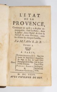 BRIANCON (Robert de) L'état de la Provence contenant ce qu'il y a de plus remarquable dans la police, dans la justice, dans l'église & dans la noblesse de cette province avec les armes de chaque famille. Paris, Auboin, Emery & Clousier, 1693, 3 vol. in-12, veau brun, dos à nerfs, ornés. EDITION ORIGINALE illustrée de 26 planches.