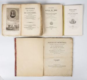 CANAL DU MIDI Pièces et mémoires tendant à prouver la nécessité de la prolongation du canal du midi jusques à Tarn et à démonter les avantages qui résulteraient de sa direction vers Montauban. Montauban, Fontanel, An XI, in-4, 32 pp. - 9 pp. br., couv. marbr. Avec une grande carte. RIQUET DE BONREPOS (Pierre-Paul). Histoire du canal de Languedoc rédigée sur les pièces authentiques conservées à la Bibliothèque impériale et aux archives du canal. Par les descendants de Pierre-Paul Riquet de Bonrepos. Paris, Crapelet, Deterville, An XIII-1805, in-8, br. couv. muette. EDITION ORIGINALE illustrée d'un frontispice, un tableau dépliant et une carte repliée. GUIDE du voyageur sur le canal du midi et ses embranchements. Seconde édition. Toulouse, Douladoure, 1855, in-8, br. couv. impr. Avec 2 cartes et une esquisse. Mq. le portrait de Riquet. OBSERVATIONS sur un projet de canal de navigation latéral à la Garonne, de Toulouse à Bordeaux. Agen, Prosper Nouvel, 1832, in-8, br. couv. impr. Ens. de 4 vol.