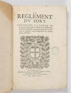 FELIX (Antoine de). Le règlement du sort. Contenant la forme et la manière de procéder à l'élection des officiers de la ville de Marseille. Revue & augmentée de nouveau de plusieurs autres réglemens & ordonnances de police. Marseille, Claude Garcin, 1654, in-4, 163 pp., vélin sali rigide et us. Rousseurs.