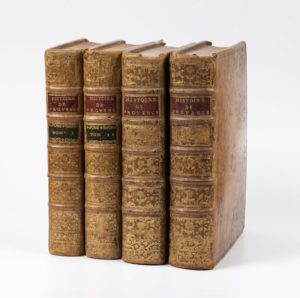 PAPON (Jean-Pierre) Histoire générale de Provence, dédiée aux Etats. Paris, Moutard, 1777-1778, 2 vol. in-4, veau marbr., dos à nerfs, pièce de titre rouge et verte. PAPON. Histoire générale de Provence. Tome III et IV. Paris, Pierres, 1784 -1786, 2 vol. in-4 veau marbr., dos à nerfs, ornés (rel. légèrement différentes). EDITION ORIGINALE. Bien complet des 2 cartes de la Provence et des 18 planches hors texte. Soit un ens. de 4 vol.