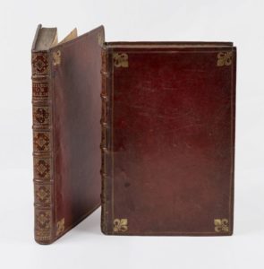 RUFFI (Antoine de) Histoire de la ville de Marseille contenant tout ce qui s'est passé de plus mémorable depuis sa fondation, durant le temps qu'elle a été République et sous la domination des romains, etc. Marseille, Henri Martel, 1696, 2 vol. in-fol., 3 ff. - 5 ff. - 496 pp. - 1 f. - 402 pp. - 6 ff., maroquin rouge, 2 filets dor. encadr.les plats avec fleurs de lys aux angles, dos à nerfs, ornés, tr. dor. (rel. de l'époque).Seconde édition. Avec 2 vignettes et une planche généalogique des vicomtes de Provence. Qq. traces sur les plats. De la bibliothèque de monsieur le comte Godefroy de Montgrand.