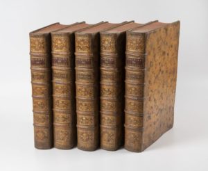 VAISSETTE (D.Jos) & VIC (de) Histoire générale de Languedoc, avec des notes et pièces justificatives. Paris, Vincent, 1730 -1745, 5 vol. in-fol., veau marbr., dos à nerfs, ornés (rel. de l'époque). EDITION ORIGINALE illustrée de 4 cartes aux contours coloriés et 28 (sur 31) planches hors-texte conforme à la table des planches dans chaque tome, nombreux en-têtes et culs-de-lampe. Dos habillement restaurés. Qq. brunissures à certaines pages. Manque la planche amphithéâtre de Nismes au tome 1 et 2 pl. de la cathédrale d'Albi au tome IV. Tiré uniquement à 850 ex. Brunet V, 1029.