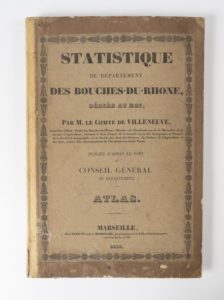 VILLENEUVE - Statistiques du département des bouches du Rhône. Marseille, Ricard,1821-1829, 4 forts vol. in-4, plein papier (rel. us.). Rousseurs. - Statistique du département des bouches du Rhône dédiée au Roi. Atlas. Marseille, Feissat 1834-1826, in-fol. demi-rel. vélin, couv. ill. Avec 25 planches. Rousseurs. ON JOINT : La table alphabétique. Marseille, 1841, in-4, demi-rel. veau vert. Ens. de 6 vol.