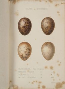 LEFEVRE Atlas des oeufs des oiseaux d'Europe. Paris, Lefevre, 1845, in-4, demi-rel. veau vert, dos lisse (rel. us.). Avec 96 planches (sur 136) coloriées. Fortes rousseurs, piqûres, épidermures sur l'ensemble des planches.
