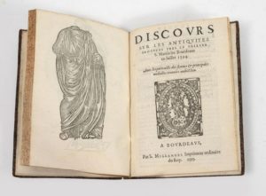 Chronique bourdeloise composée cy-devant en latin par Gabriel de Lurbe advocat en la cour procureur & syndic de la ville de Bourdeaus. A Bourdeaus, Millanges, 1594, in -8, veau brun, dos à nerfs, orné (plats us ). 60 chif. -3 pl. (dont le colophon-). Discours sur les antquitez trouvees pres le prieuré st. ; martin lez Bourdeaus en juillet 1594. A Bourdeaus, Millages, 1594. 6 ff. chiff. 58 à 63. De la bibliothèque Du Plessis Villoutreys.
