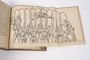 Arcangelo TUCCARO (1535-1602) Trois dialogues du Sr Archange Tuccaro, de l'Abbruzo au Royaume de Naples. Chez Georges Griveau, Tours, 1616. In-8 (21.3 x 17 cm). Tranches marbrées. Erreurs de paginations aux pp. 59 et 60, p. 63 lire 65, p. 88 lire 98, pp. 125 et 126, saut de la p. 132 à 135, p. 139 non marquée, p. 146 lire 149, p. 16 lire 163, p. 162 lire 164, p. 164 lire 166. 199 ff. mal chiffrés 197. Mêmes pl. 104 et 105. 86 pl. gravées sur bois dans le texte et une grande pl. dépliante entre pp. 142 et 143. Rel. en basane marron à filets et caissons dorés, post. Traces prob. de cachet effacé sur la p. de t. Qlq. inscriptions manuscrites et annotations en marges au crayon ou à l'encre. Certains feuillets insolés, salissures, rousseurs, qq. mouillures, taches, petite déchirure à pl. dépliante, rares trous ; charnières fendues, taches.