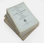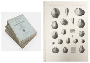 L.G. DE KONINCK ou P.H. NYST Annales du musée royal d'histoire naturelle de Belgique. F. Hayez imprimeur, Bruxelles. 1885. Avec planches en noir, certaines doubles. 9 volumes grand in-folio, brochés : - Tome II : Faune du calcaire carbonifère. Première partie. 31 pl. - Tome III : Conchyliologie des terrains tertiaires. [x2] 263 pp. - 28 pl. - Tome VI : Faune du calcaire carbonifère. Troisième partie. [x2] 170 pp. - 21 pl. - Tome VIII : Faune du calcaire carbonifère. Quatrième partie. [x2] 240 pp. - pl . 22 à 54, avec 32bis, 33bis et 42bis. - Tome XI : Faune du calcaire carbonifère. Cinquième partie. [x2] 283 pp - 41 pl. Anciens cachets de bibliothèques de Budapest ou de la Société Archéologique de Belgique. Piqûres, taches et rousseurs. Quelques salissures, taches, déchirures et cassures aux angles des plats.