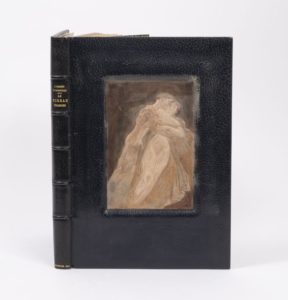 BARBEY d'AUREVILLY (Jules). Le Rideau cramoisi. Eaux-fortes en coul. de A. RASSENFOSSE. Bruxelles, Librairie Edmond Deman, 1907. In- 4. Ex. 19 / 125. 67 pp. 14 pl. hors textes. Maroquin bleu nuit, le 1er plat orné d'un couple d'amants enlacés en cuir repoussé en relief, monogrammé en bas à droite H.B. ; dos à cinq nerfs au titre doré ; tranche dorée ; revers des plats doublés de maroquin marron et filets dorés formant encadrement, celui du 1er plat signé H[enri Émile] BLANCHETIÈRE [1881-1933]. pp. de garde en tissu persan. Usures, petites rousseurs, frottements, qlq. rayures. Dans un emboîtage (griffures et frottements).