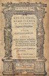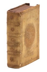 Anvers, Christophe Plantin, 1582. In-16, vélin à recouvrements, filet doté et petits fleurons d'angles, grand médaillon ovale au centre comportant, de part et d'autre, le supralibris IA.D.B. et la date ANNO 1592, dos lisse orné, tranches jaspées (Reliure de l'époque).Cinquième et dernière édition de ce recueil publiée par Christophe Plantin. Il s'agit d'un florilège de maximes et d'apophtegmes tirés principalement de Cicéron, Démosthène, Térence et Érasme.
